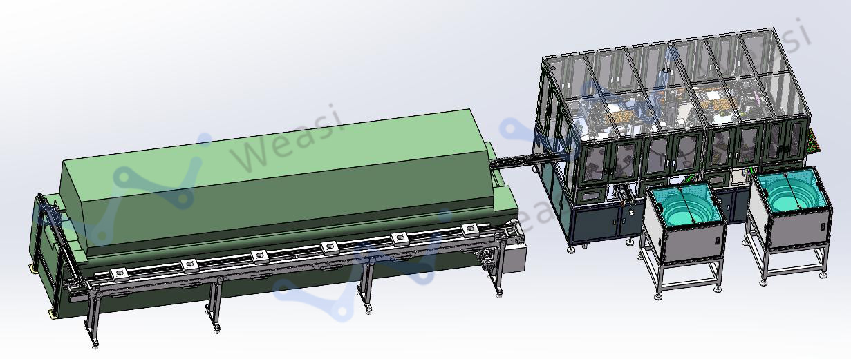 The automatic assembly equipment for grinding and welding of surge protection device is a equipment for grinding, welding and automatic assembly of the internal chip of surge protection device, which is one of the important components of surge protection device. The shell is automatically loaded by vibrating disk, and the varistor, short insert and long insert are loaded by manual swing disk. According to the actual process, the surface of the meshing part is polished automatically, and the welding of different inserts is realized by high temperature welding, reflow welding, etc., and the semi-finished products are finally output.