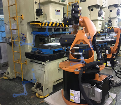 3.The robot takes the workpiece and turns it over, and the press bends four peripheral tongues (bends four peripheral Bridges);